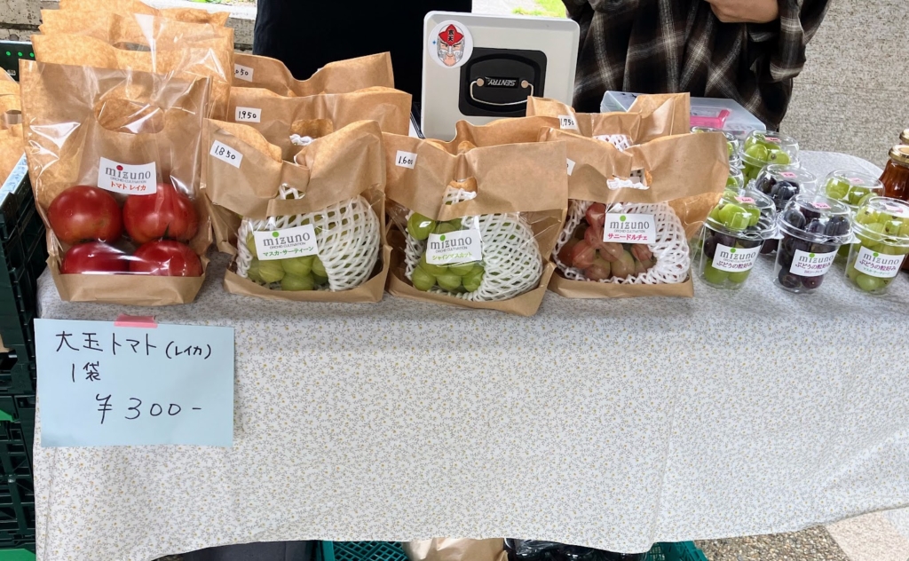 トマトに加えて、ぶどうの販売も始まりました。糖度が高くおいしいぶどうをお手軽に味わえるパック入りも並んでいます。
